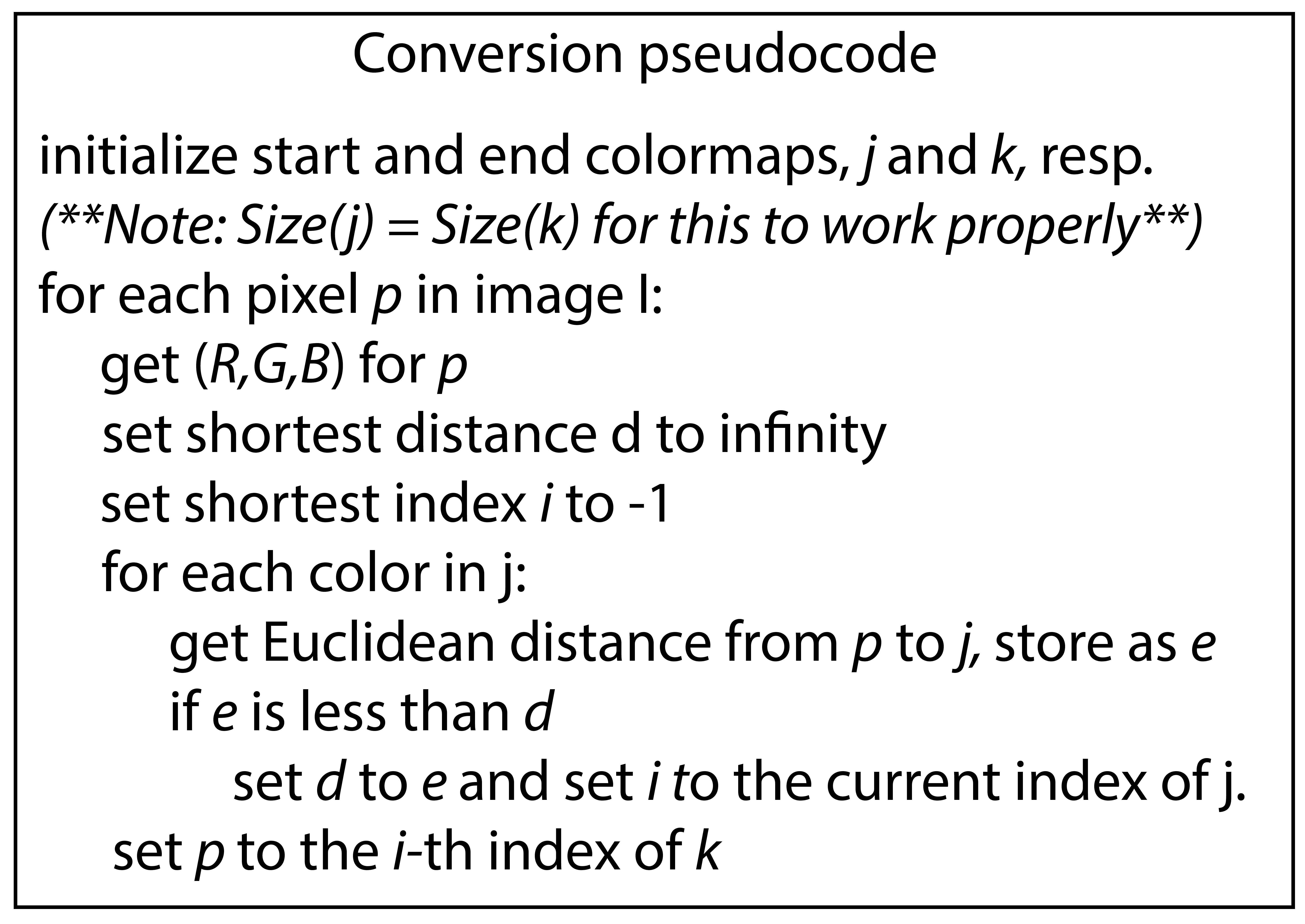 The mapping of numbers to colors with a colormap necessarily uses a one-to-one relation. So, our approach identifies the color as a RGB primary associated with each pixel in an image provided, finds the closest match in a rainbow colormap by Euclidian distance in RGB space, and uses the matching color’s position in the colormap to infers the underlying fractional numeric value. With this fractional value and a new colormap, we can select a new color to convert the original pixel to. This process is repeated for each pixel in the image, resulting in a new image with the same dimensions but a new colormap. See pseudocodein Figure 6.2.