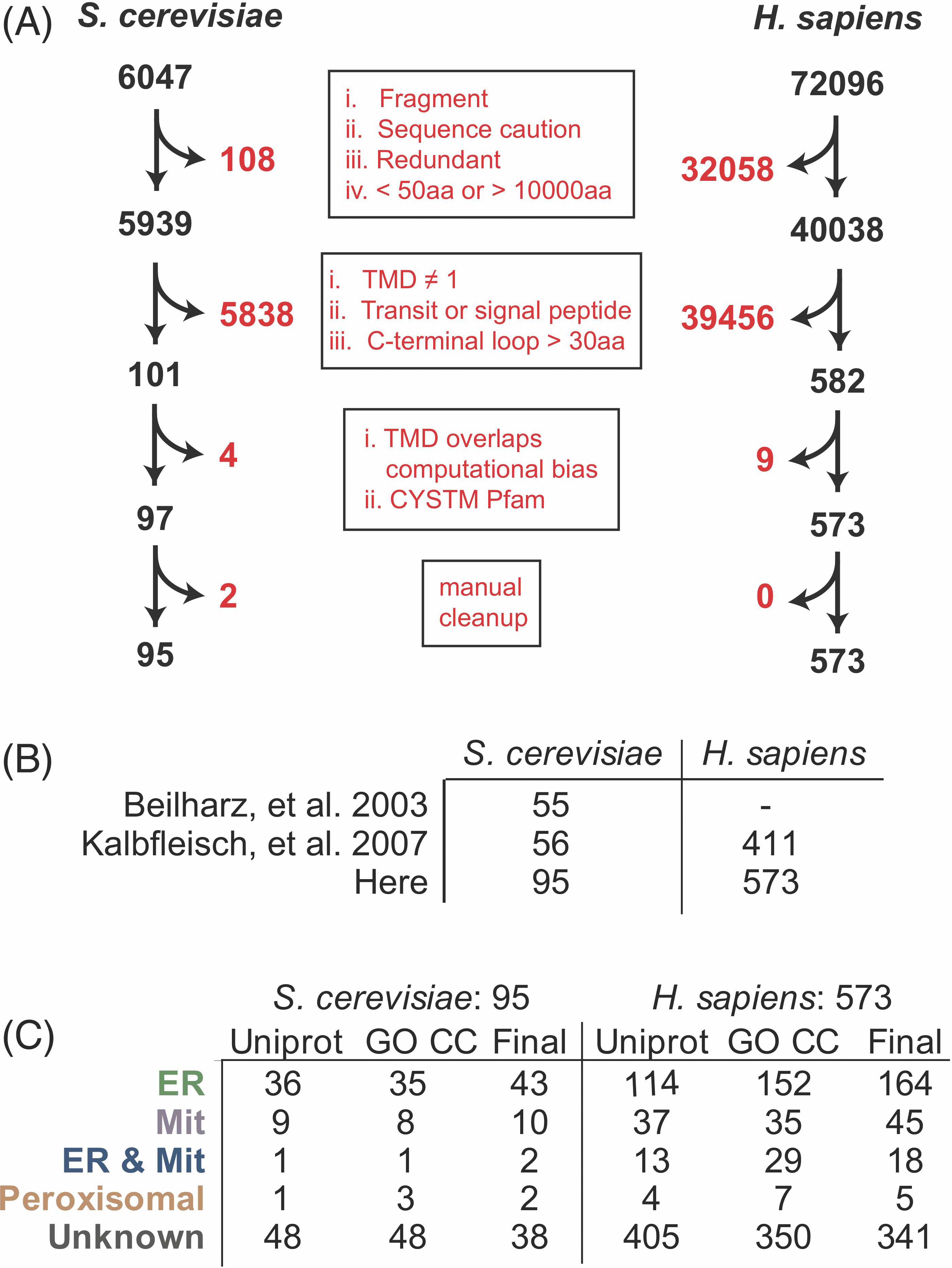 Decoding the signaling information in membrane proteins responsible for their correct targeting to cellular membranes is still a mystery. For the class of membrane proteins with a single TMD and no signal peptide, TA proteins, some observations have been made to distinguish between those destined for the ER and those destined for the mitochondria. This report provides an extensive analysis of yeast and human TA proteins to identify a set of criteria to distinguish between ER- and mitochondria-bound TA proteins. This study also includes an expansion of putative TA proteins in both humans and yeast as well as newly determined experimental localization of several yeast TA proteins.