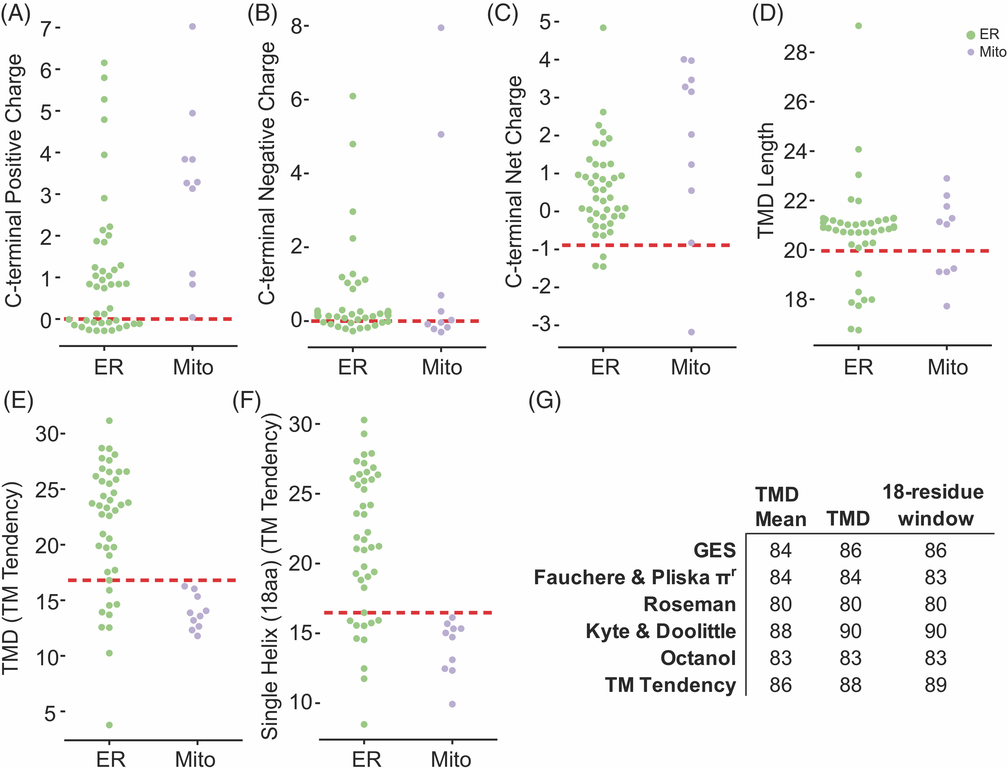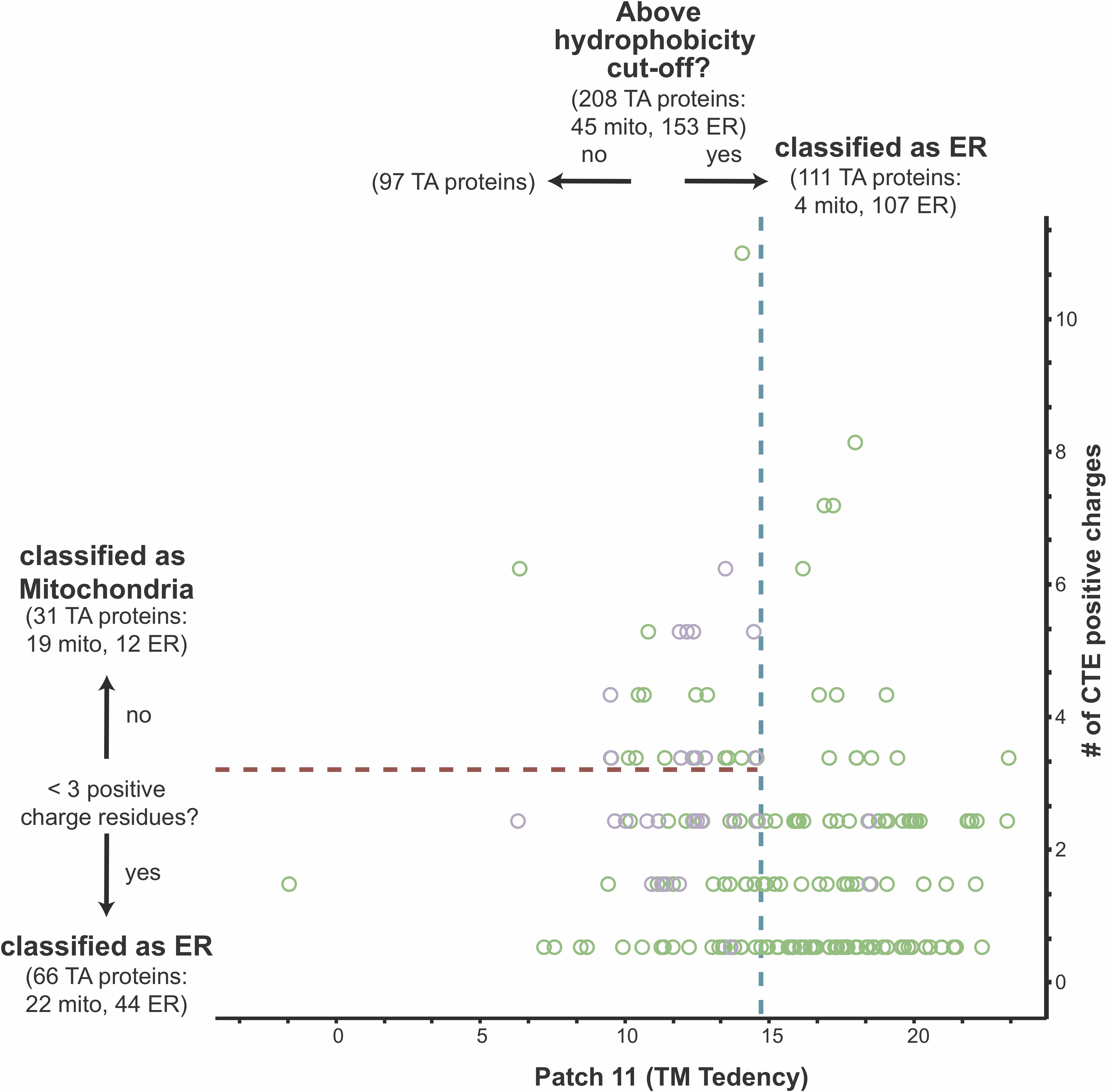 General patterns have been observed based on exploration of targeting information within the TMD and the C-terminal residues of TA proteins. ER TA proteins tend to have more hydrophobic TMDs (Chitwood et al., 2018; Guna et al., 2018; Rao et al., 2016; Wattenberg and Lithgow, 2001) while some mitochondria TA proteins are amphipathic (Wattenberg and Lithgow, 2001). By modifying the positive charge following their TMDs with an example TMD, studies have shown how insertion by the GET pathway into the ER membrane can be impaired (Figueiredo Costa et al., 2018; Rao et al., 2016). Distinction between peroxisomal and mitochondria TA proteins have been made based on the charge of their C-terminal tails, whereas mitochondria and ER TA proteins in mammals are differentiated by a combination of TMD hydrophobicity and C-terminal charge (Costello et al., 2017). A charged tail was overcome by increasing the hydrophobicity of the TMD, directing the mitochondrial TA protein to the ER. Guna and colleagues determine a threshold in total hydrophobicity by modifying a model TMD to delineate substrates that are inserted either via the GET or EMC pathways (Guna et al., 2018). Throughout these previous works, the ability of these rules to separate ER vs mitochondrial TA proteins at-large has not been systematically assessed, so their broader applicability is still unclear.