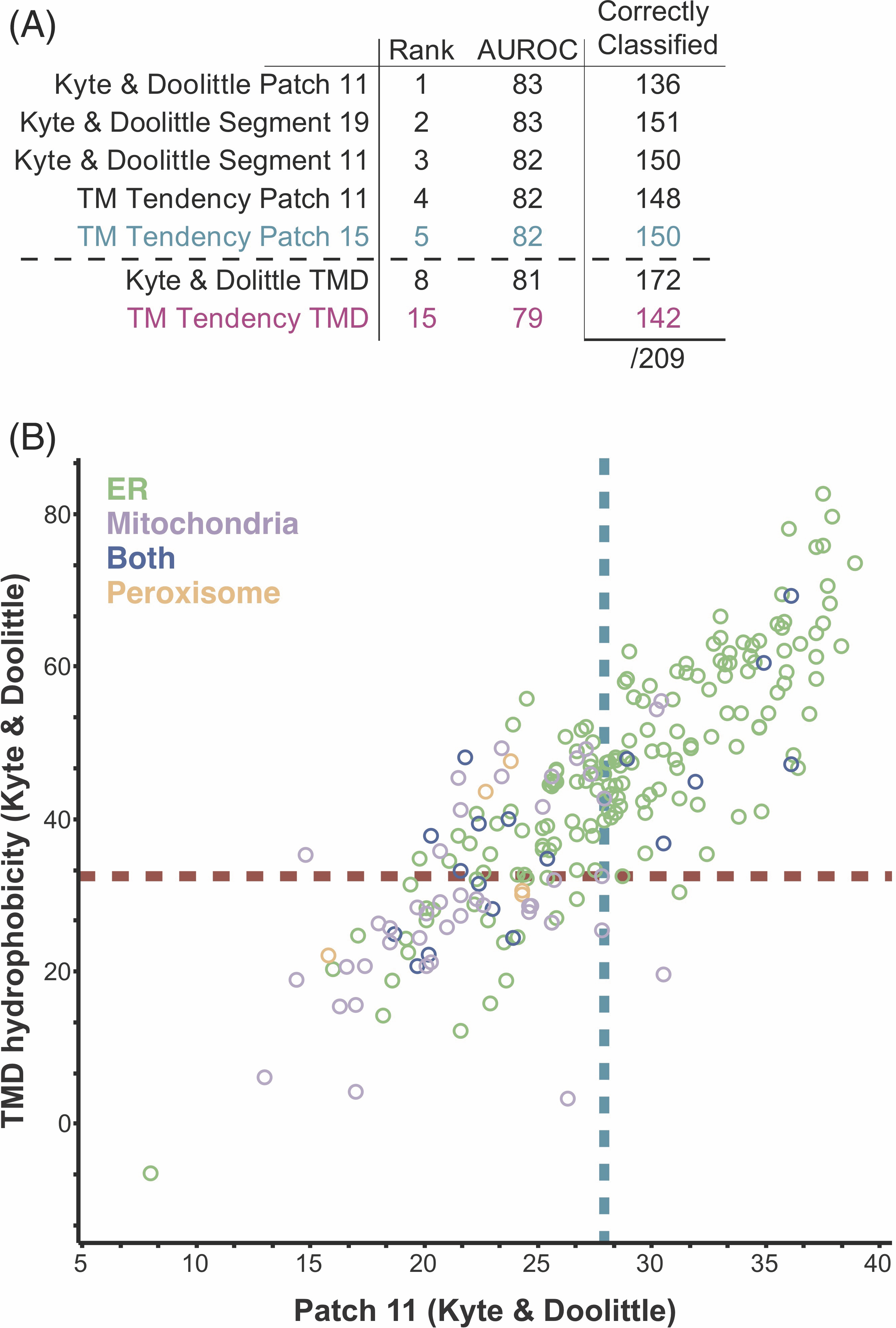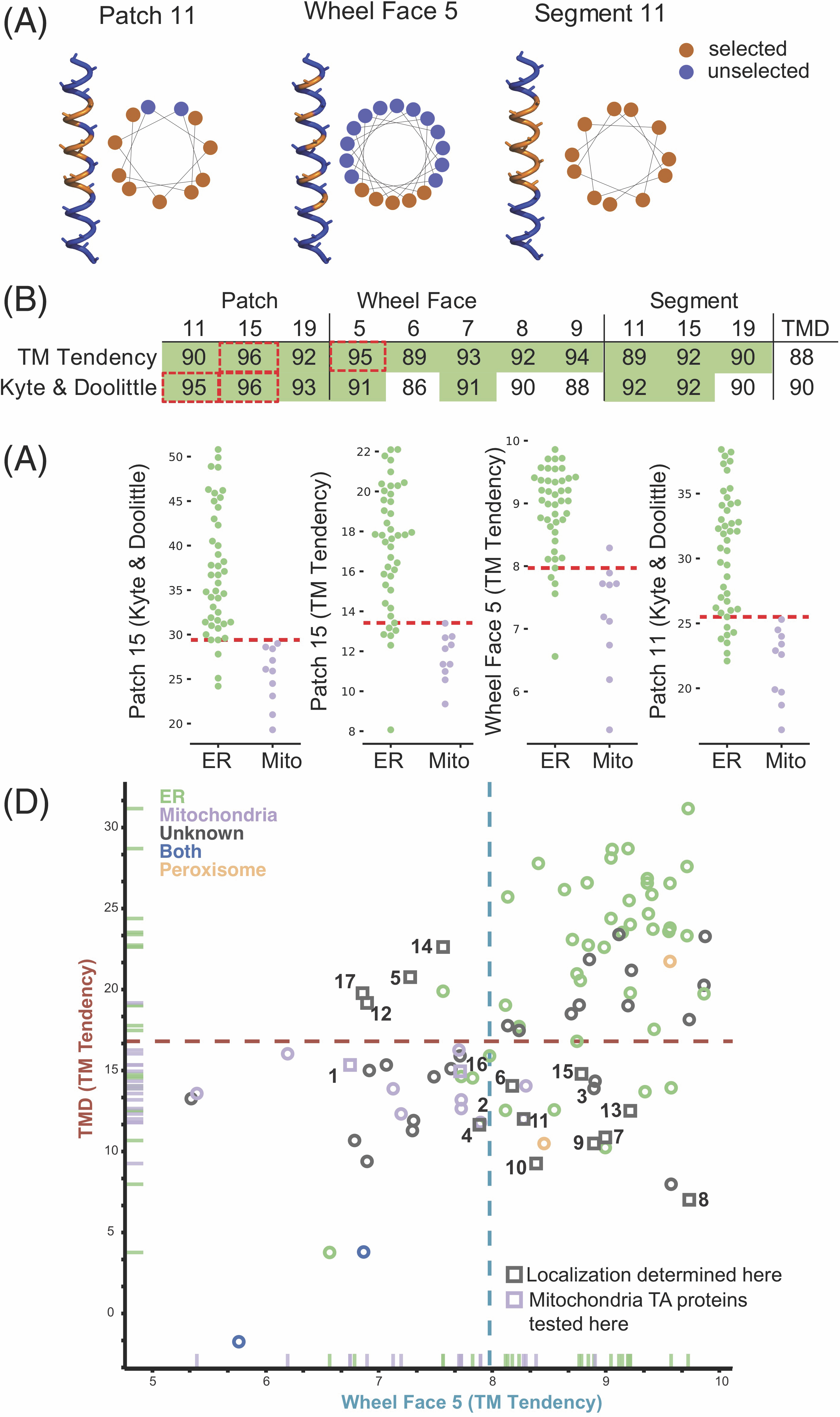 Furthermore, it was also reported that TMDs where the most hydrophobic residues cluster to one side of a helical wheel plot (Schiffer and Edmundson, 1967), a 2D representation of an alpha-helix, bind more efficiently to Sgt2 (Lin et al., 2021). We sought to examine if this clustering is a feature of ER TA proteins and absent in mitochondria TA proteins. This clustering we define as a helical wheel face (Wheel Face) and specify a length by the number of residues selected (Figure 4.3A,B). We also extend the face along the sides of the helix, defining a Patch, selecting three of the four residues in a single turn of a helix. Patch geometries are specified by length of the segment considered, that is, Patch 11 is confined in a 11 segment residues with 9 residues selected (Figure 4.3A,B). Improvements in classification over the total hydrophobicity metric are seen in several cases (Figure 4.3B, green, Supplementary Figure 4.1B, green, Table 4.3). The metrics with the best classification capability are Patch 15 (Kyte & Doolittle and TM Tendency), Wheel Face 5 (TM Tendency scale) and Patch 11 (Kyte & Doolittle scale; Figure 4.3B, dashed red box). These metrics have an improved AUROC value of 96, 96, 95 and 95, respectively, compared to the TMD hydrophobicity score of 90 (Kyte & Doolittle) and 88 (TM Tendency; Figure 4.3B). At the best threshold of the ROC curve, these metrics correspond to five, seven, six and eight miscategorized proteins, respectively. A scatter plot illustrates how these metrics translate to improved separation of ER and mitochondrial TA proteins (Figure 4.3C).