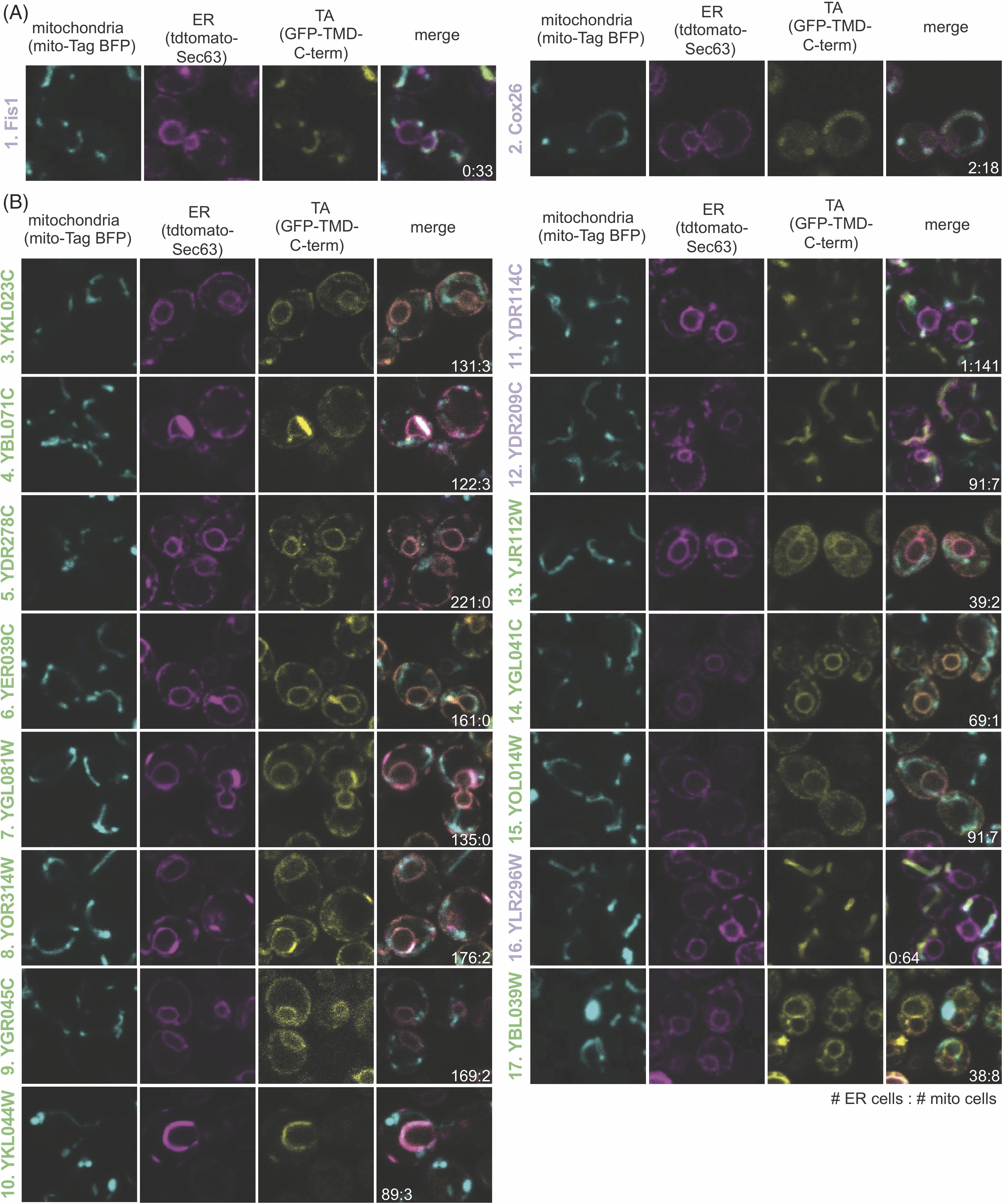 This experimental setup and computational analysis were first applied to the known mitochondria proteins Fis1 and Cox26 (Hartley et al., 2019; Levchenko et al., 2016; Rao et al., 2016). The analysis correctly determines these proteins to colocalize with BFP, thus correctly classifying them as mitochondria TA proteins (Figure 4.4A). We then experimentally tested the 15 Unknown TA proteins where 11 localize to the ER, three to the mitochondria, and one to another cellular compartment (Figure 4.4B, Table 4.1). The localization of this latter TA protein cannot be determined by our experimental setup except to say it does not clearly colocalize with the ER or mitochondria markers visually or through our computational analysis (Table 4.4). The shape of the organelle is consistent with localization to the ER-derived vacuole (Figure 4.4B, #17) (Vida and Emr, 1995). In total, we report the first localization of 10 previously Unknown TA proteins.