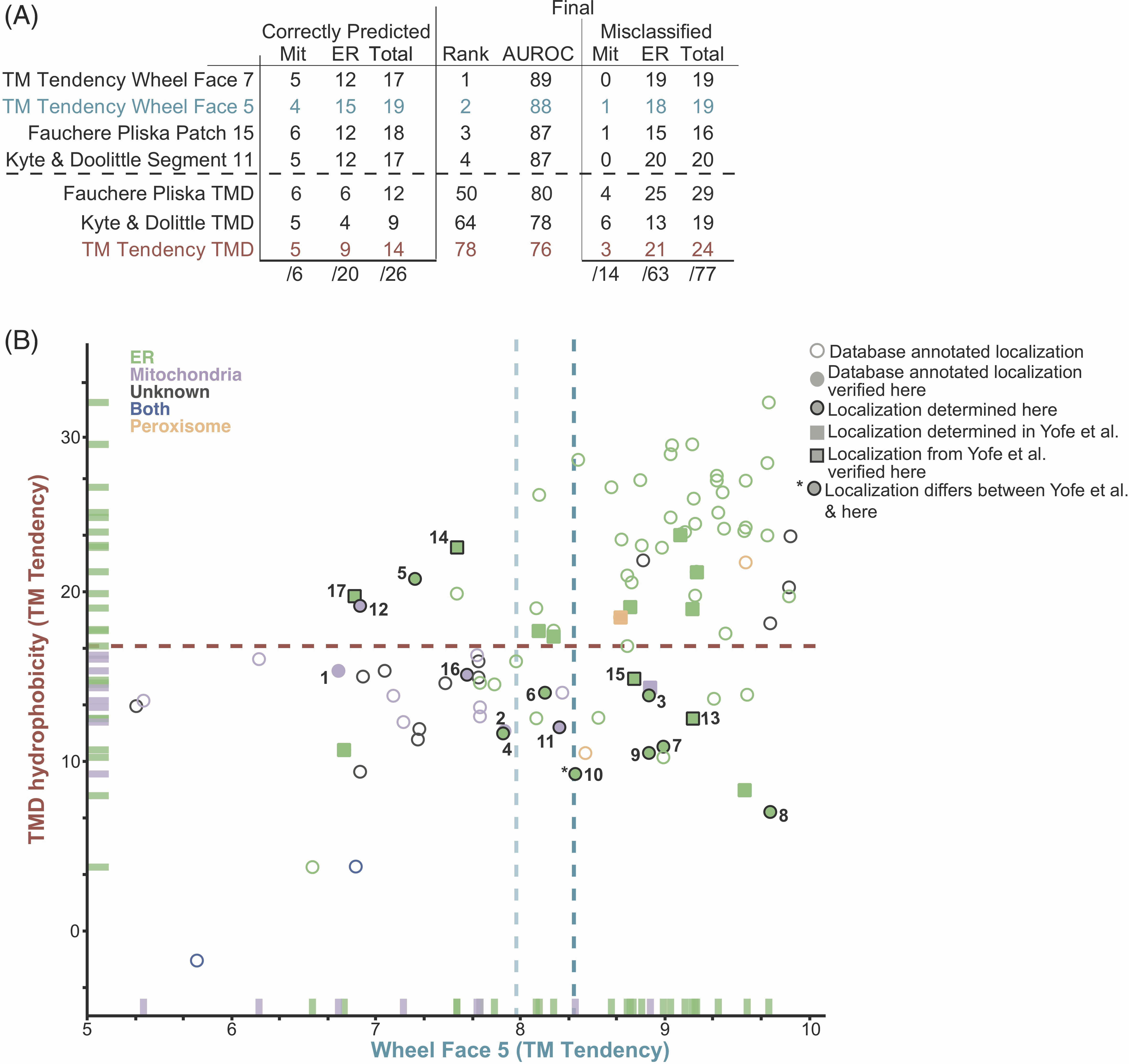 The newly determined localizations were compared to the predicted localizations of the best performing hydrophobicity metrics. Total hydrophobicity metrics across all scales only correctly predict 9 or 14 of the 26 ER and mitochondria TA proteins. Experimental localizations from this work and the Schuldiner Lab (Weill et al., 2018) result in a putative yeast TA protein list with 88% having known localizations (Figure 4.5A). With most localizations known, comparing metrics based on AUROC values is a good representation of the overall dataset (Table 4.6). The best performing metrics were Wheel Face 7 (TM Tendency) and Wheel Face 5 (TM Tendency), with scores of 89 and 88, respectively vs the TMD hydrophobicity AUROC score of 76 (Table 4.6). These metrics correctly predicted the localization of 19 out of 26 and 17 out of 26, respectively, of the subset of our test set that localized to the ER or mitochondria (Figure 4.5A,B). A Patch geometry using the Fauchere & Pliska scale performs well when predicting new localizations–correctly predicting 18 of 26 localizations (Figure 4.5A). Segment metrics performed similarly when predicting new localizations and their AUROC values improved with the inclusion of the new localizations (Figure 4.5A). In all, metrics focused on the organization of hydrophobic residues within the TMD of TA proteins better predict TA protein localization–the best consider just a five or seven residue face or a fraction of the TMD.